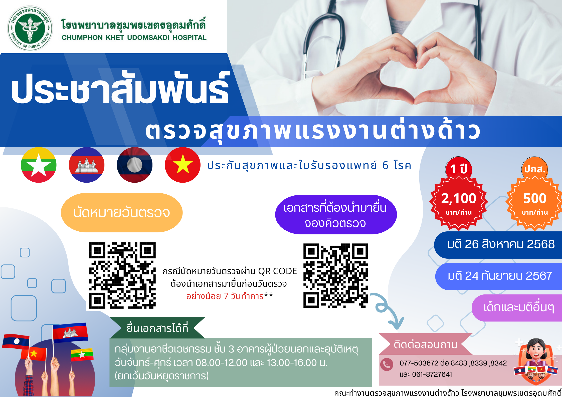 ประกาศเกี่ยวกับประชาสัมพันธ์ตรวจสุขภาพแรงงานต่างด้าว โรงพยาบาลชุมพรเขตรอุดมศักดิ์ Published: 08 October 2025 Hits: 17