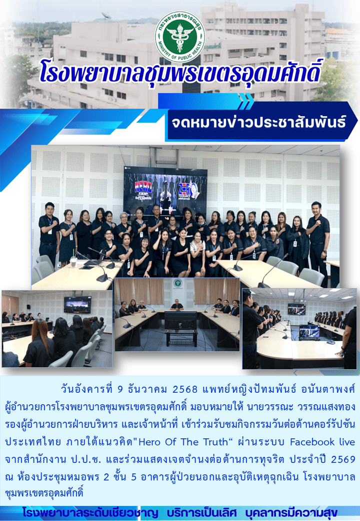 ประกาศเกี่ยวกับกิจกรรมวันต่อต้านคอร์รัปชัน ภายใต้แนวคิด "Hero Of The Truth" โรงพยาบาลชุมพรเขตรอุดมศักดิ์ Published: 09 December 2025 Hits: 60